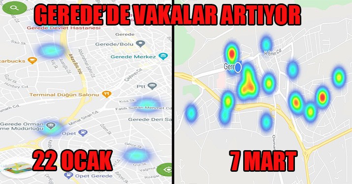Bolu koronavirüs salgınında yüksek riskli iller arasında yer alırken Gerede ilçesinde de vakaların arttığı belirlendi. Hayat Eve Sığar (HES) uygulaması Gerede’de gelinen durumu gözler önüne serdi. Gerede’deki vakaları gösteren HES haritasında, 22 Ocak tarihi itibariyle kırmızı alanların hiç kalmadığı, hatta vaka sayısında sıfıra yaklaşıldığı görülürken bugün gelinen noktada işlerin terse gittiği anlaşıldı. 7 Mart tarihinde vaka yoğunluğunu belirten kırmızı alanların yeniden oluştuğu ve bu alanların gittikçe genişlediği görüldü.
