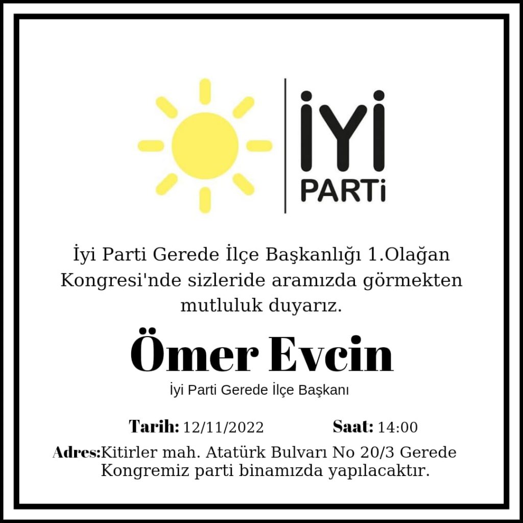 İyi parti Gerede ilçe başkanı Ömer Evcin, “Kongremizin hayırlı olmasını diliyorum. Gerede’mizin ve memleketimizin değişim ve dönüşümünü sağlamak üzere ehil kadroları bir araya getirmek amacıyla bu kongremizi düzenleyeceğiz. Tüm halkımızı bekliyoruz. Taşın altına elini koyan herkese selam olsun” diye konuştu.